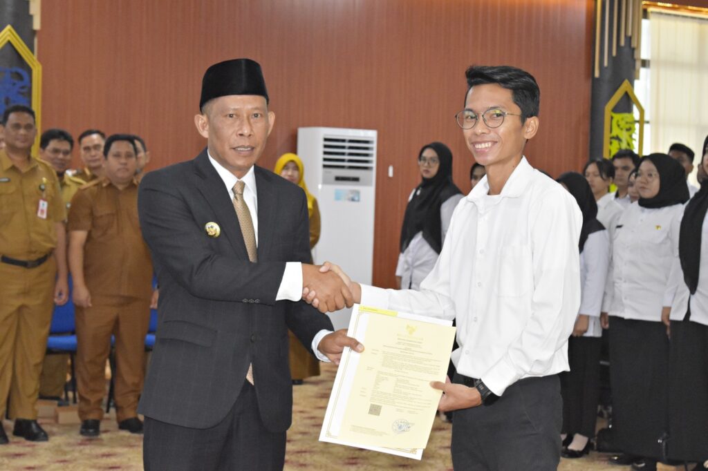 TANJUNG SELOR – Bupati Bulungan, Syarwani, S.Pd, M.Si menyerahkan SK Pegawai Pemerintah dengan Perjanjian Kerja (PPPK) Tahap II Tahun Anggaran 2024 di Ruang Tenguyun Kantor Bupati pada Selasa (30/9/25).