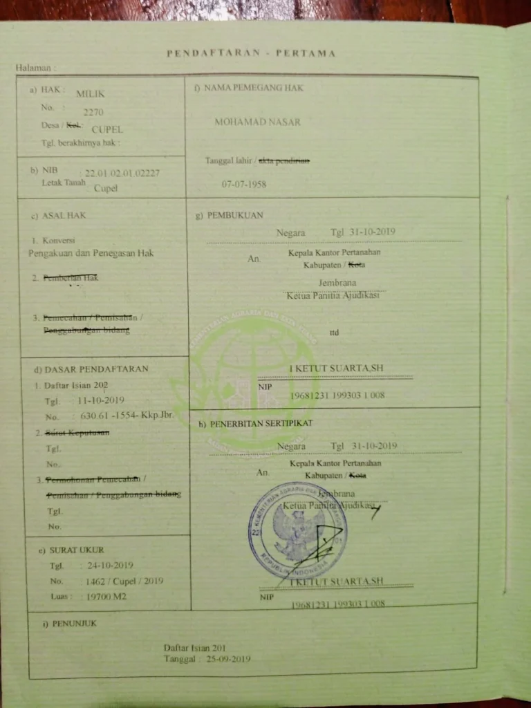 Perkaranya sudah berjalan sejak September 2020. Kini masuk tahun kelima. Statusnya? Masih penyidikan.Sertifikat Sah, Tapi Diproses Pidana, Objek yang dipersoalkan adalah Sertifikat Hak Milik Nomor 2270 seluas 19.700 meter persegi di Desa Cupel, Jembrana. Sertifikat itu terbit melalui program PTSL tahun 2019 oleh BPN Kabupaten Jembrana.