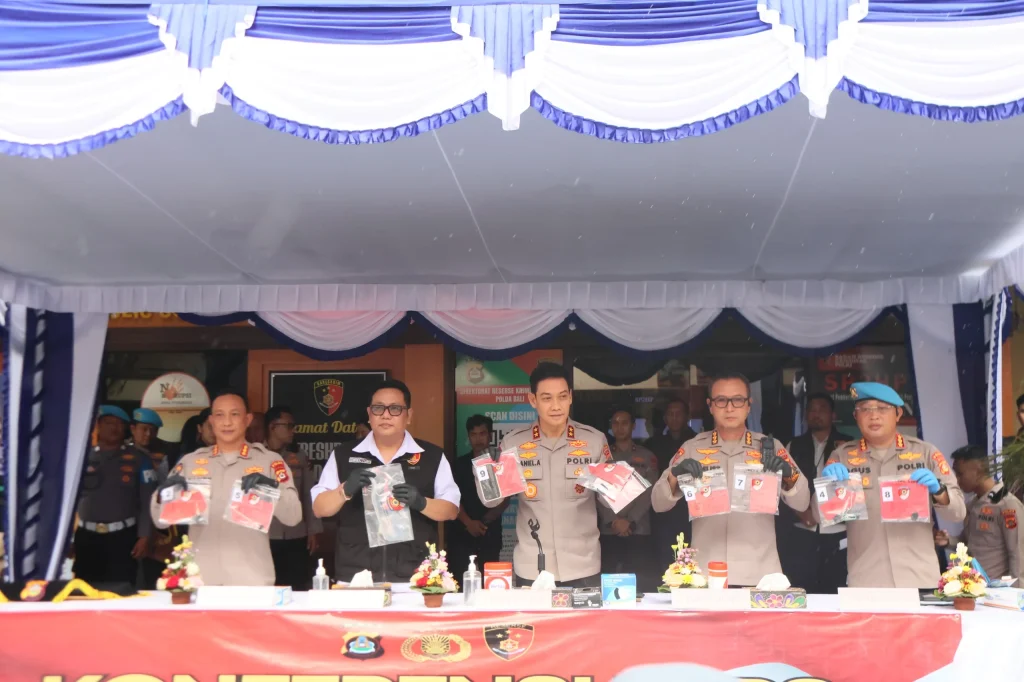 Konferensi pers yang digelar di Mapolda Bali itu dipimpin langsung Kapolda Bali Irjen Pol. Daniel Adityajaya, S.H.,S.I.K.,M.Si., didampingi Dirreskrimum Polda Bali Kombes Pol. Dr. Gede Adhi Mulyawarman, S.H.,S.I.K.,M.H., Karo Ops Polda Bali Kombes Pol. Soelistijono, S.I.K.,M.H., Kabid Humas Polda Bali Kombes Pol. Ariasandy, S.I.K., serta Kabid Propam Polda Bali Kombes Pol. I Ketut Agus Kusmayadi, S.I.K.,S.H.,M.H.