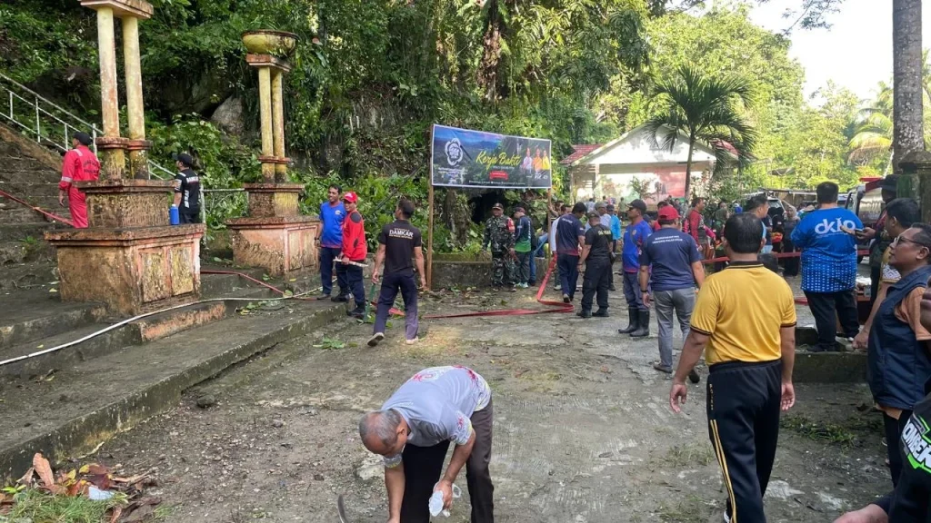 Pembersihan bangunan dan fasilitas di lokasi wisata.Untuk mendukung kegiatan, dikerahkan sejumlah sarana seperti armada dump truck DLH, kendaraan pengangkut sampah, unit damkar BPBD, serta ambulans dari Puskesmas Tanjung Palas.