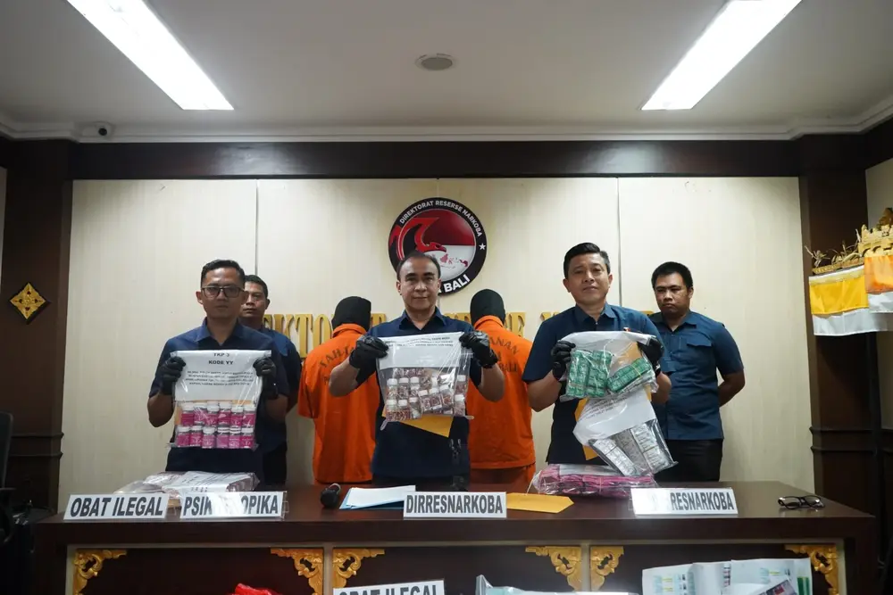 PUBLIKA BALI-Diresnarkoba Kombes Pol Radiant S.I.K., M.Hum., didampingi para Kasubdit menyampaikan Polda Bali berhasil ungkap peredaran obat-obatan tidak berijin dengan nilai pantastis kurang lebih Rp. 1.950.840, (Satu Milyar Sembilan Ratus Lima Puluh Juta Delapan Ratus Empat Ribu Rupiah), kamis 25/9/2025.