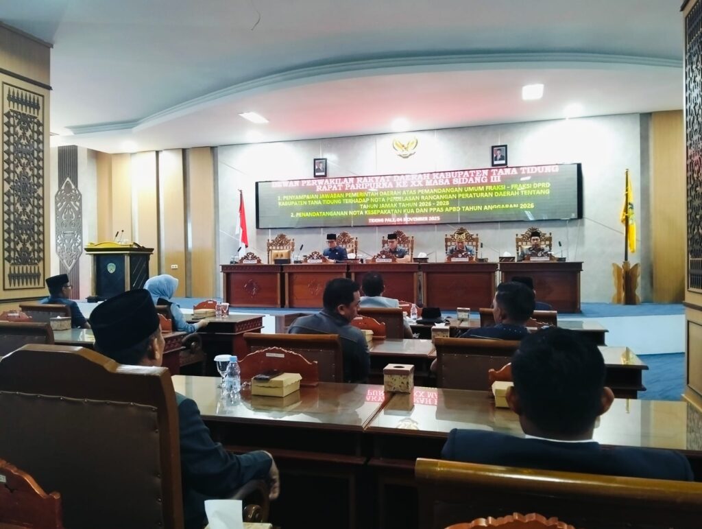 TANA TIDUNG-Dewan Perwakilan Rakyat Daerah (DPRD) Kabupaten Tana Tidung bersama Pemerintah Daerah menggelar Rapat Paripurna ke-XX Masa Sidang III Tahun 2025 yang berlangsung di ruang rapat DPRD Tana Tidung, Jalan Inhutani, Desa Tideng Pale, Kecamatan Sesayap, Kabupaten Tana Tidung, Kalimantan Utara (Kaltara), pada Selasa, 4 November 2025. Rapat ini berfungsi sebagai forum penting dalam proses pengambilan keputusan terkait kebijakan pembangunan daerah dan pengelolaan keuangan daerah.