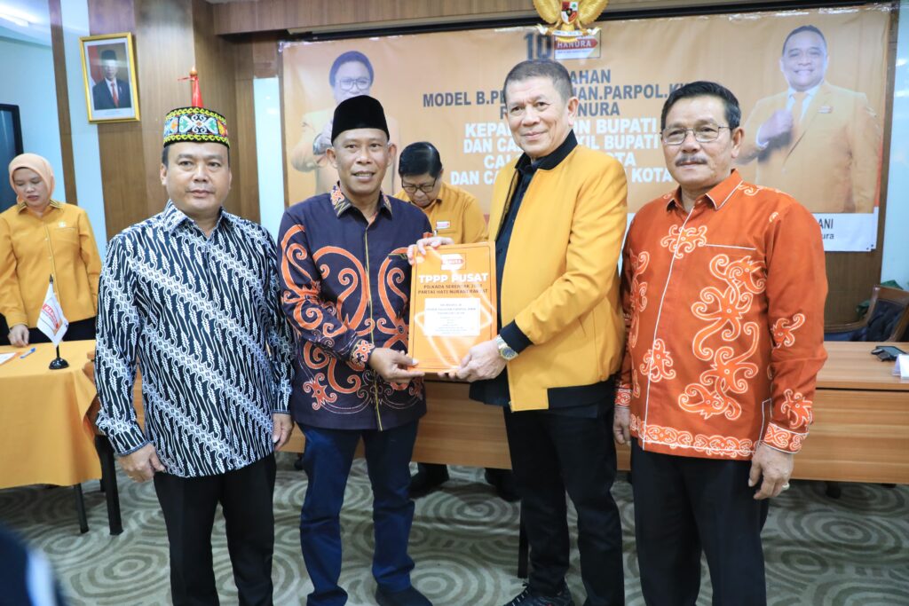 JAKARTA – Pasangan bakal calon Bupati dan Wakil Bupati Bulungan, Kalimantan Utara (Kaltara), Syarwani – Kilat menerima dukungan model B1 KWK atau SK Model Persetujuan Parpol KWK Partai Hati Nurani Rakyat (Hanura) di Kantor Dewan Pimpinan Pusat (DPP) Hanura, Jakarta, Kamis 22 Agustus.